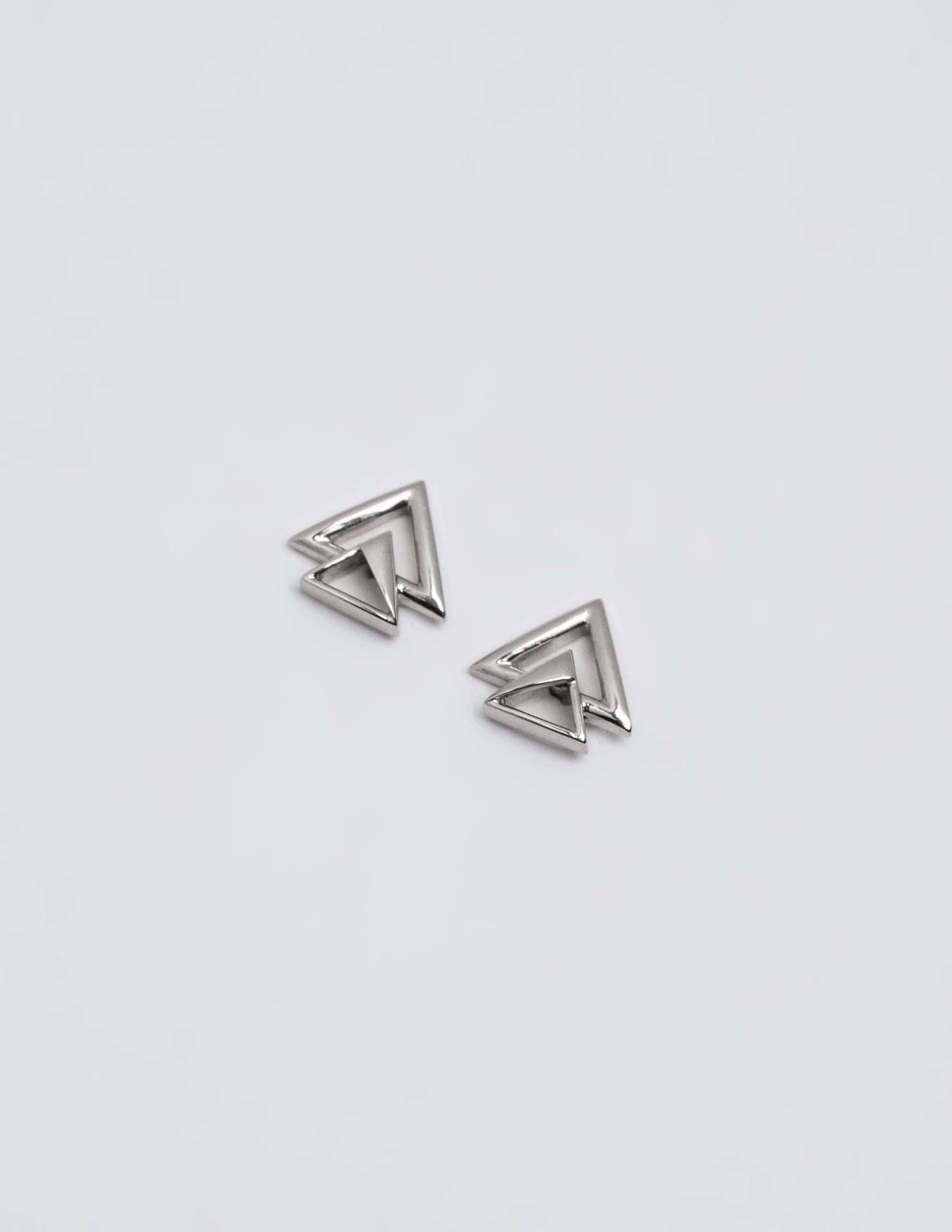 Layered triangles formed in Polished Platinum, Architectural precision meets wearable form.