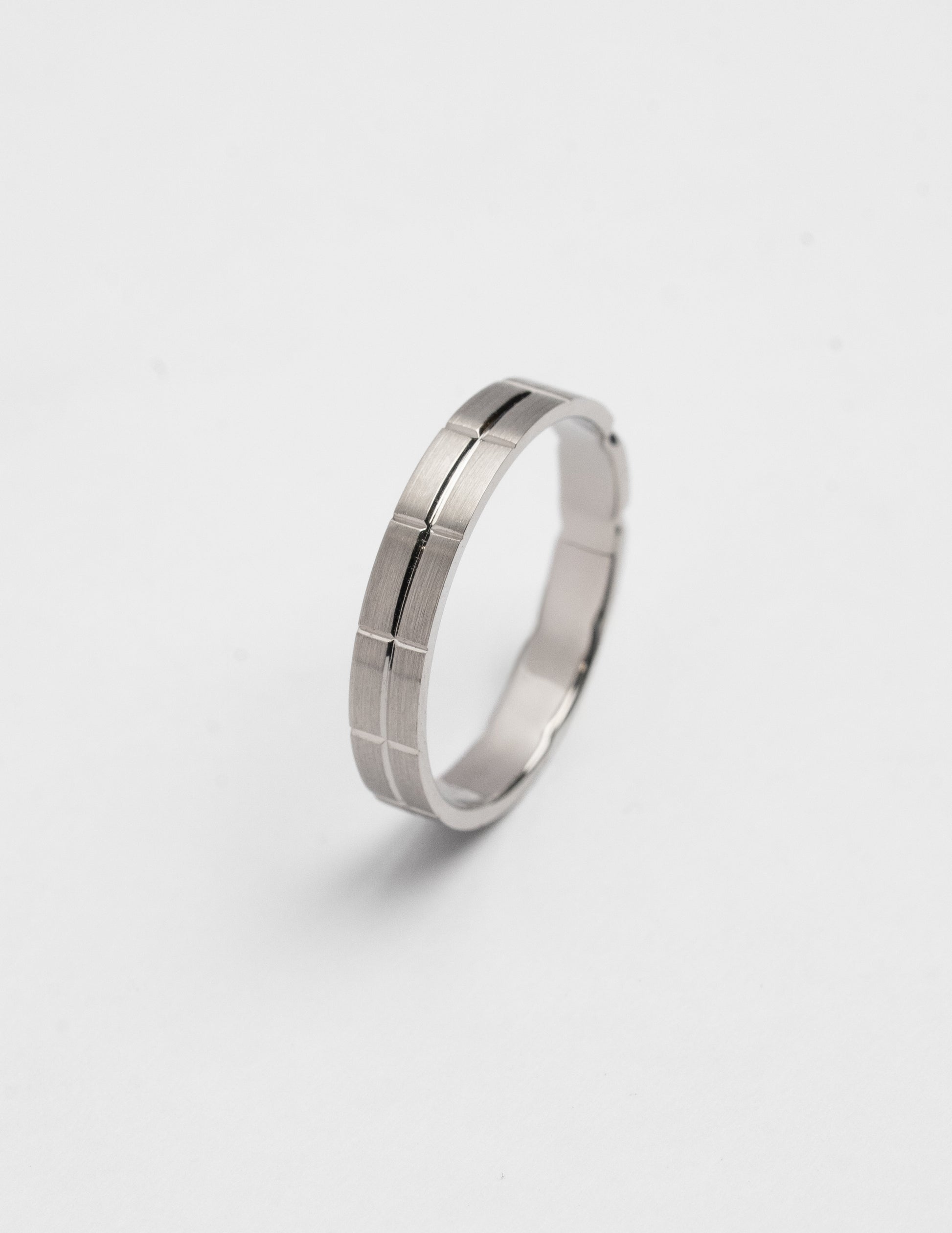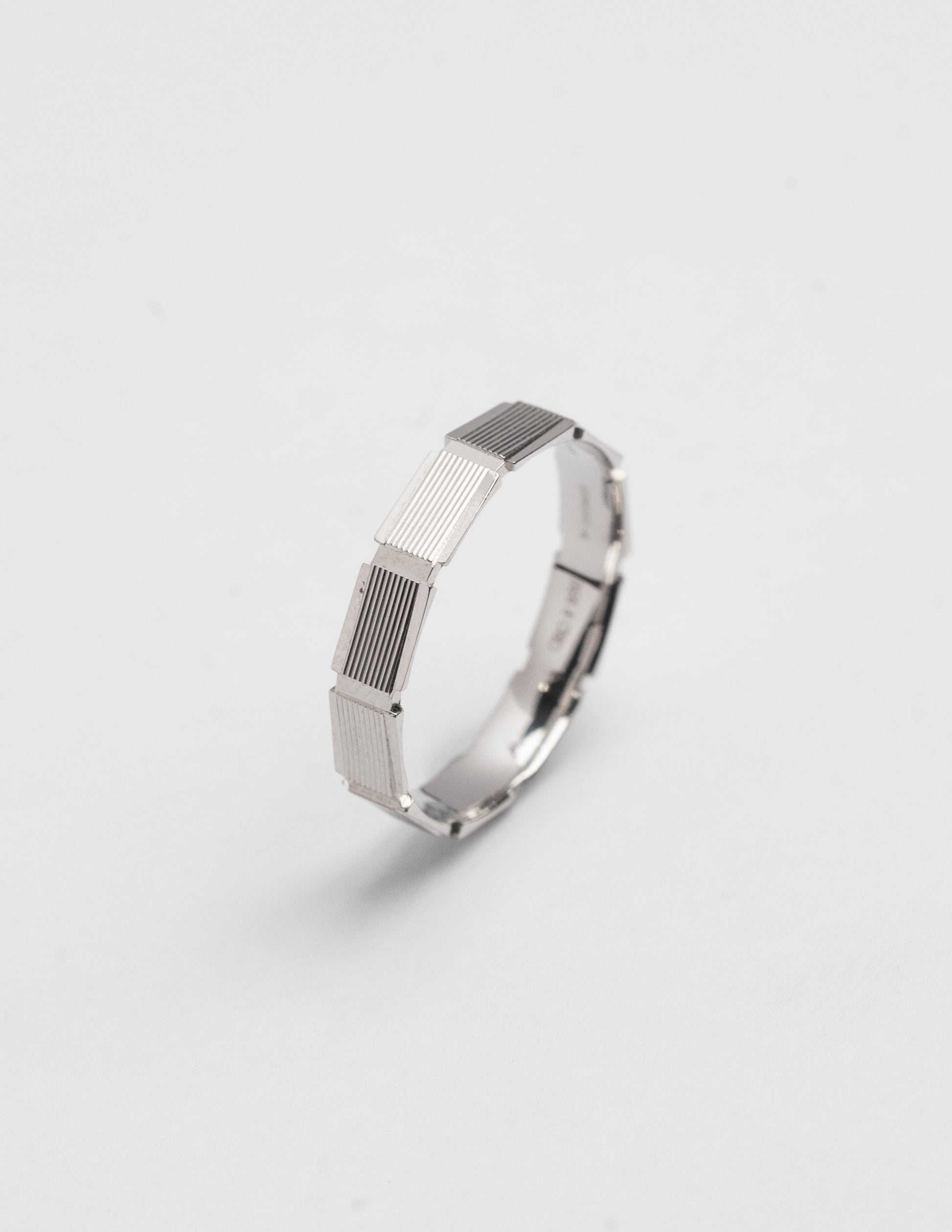 Textured panels alternate in direction, tactile and architectural, crafted in pure platinum.