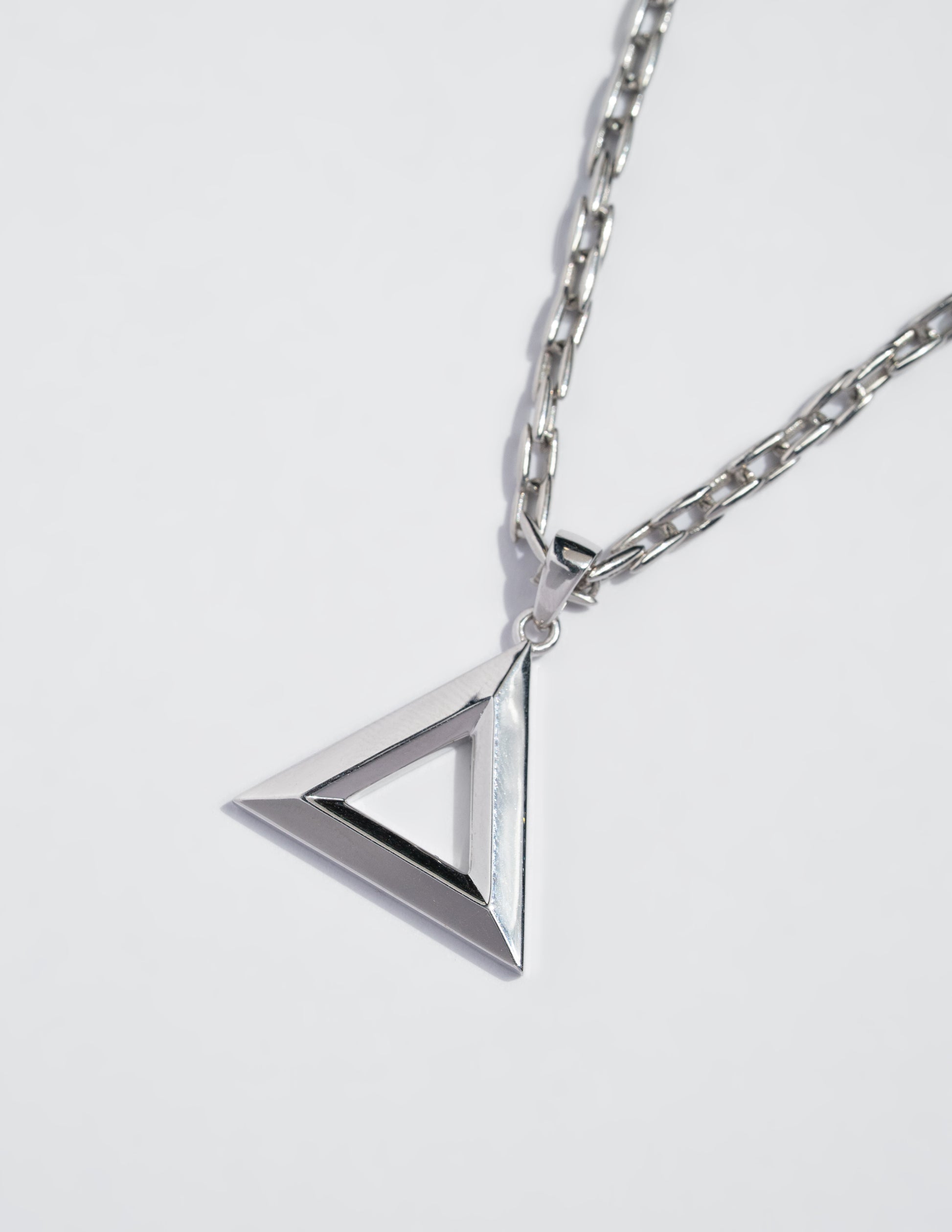 Three-dimensional triangle suspended in space, geometric and balanced, crafted in pure platinum.